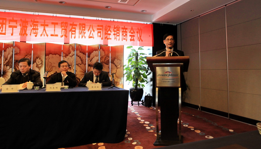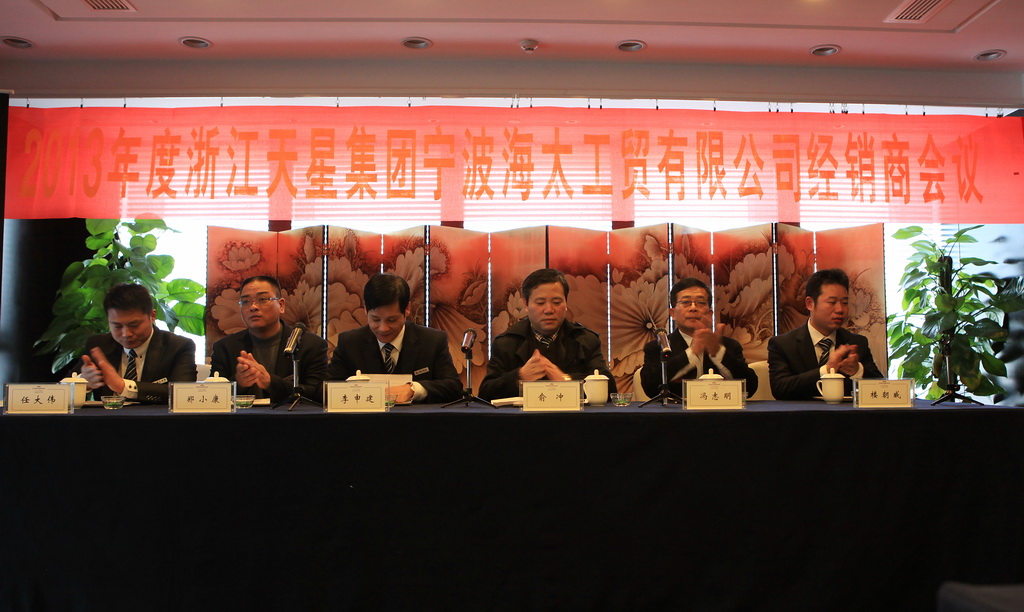 2013年度海太工貿(mào)有限公司營銷會議于2013年1月21日在寧波逸東豪生大酒店圓滿召開,控股公司浙江天星實業(yè)集團董事長俞沖、工業(yè)板副總裁馮志明,海太工貿(mào)有限公司總經(jīng)理李申建、副總經(jīng)理鄭小康、總經(jīng)理助理兼財務(wù)總監(jiān)樓朝威、營銷部經(jīng)理任大偉,及來自全國各地的海太代理商出席了本次會議。